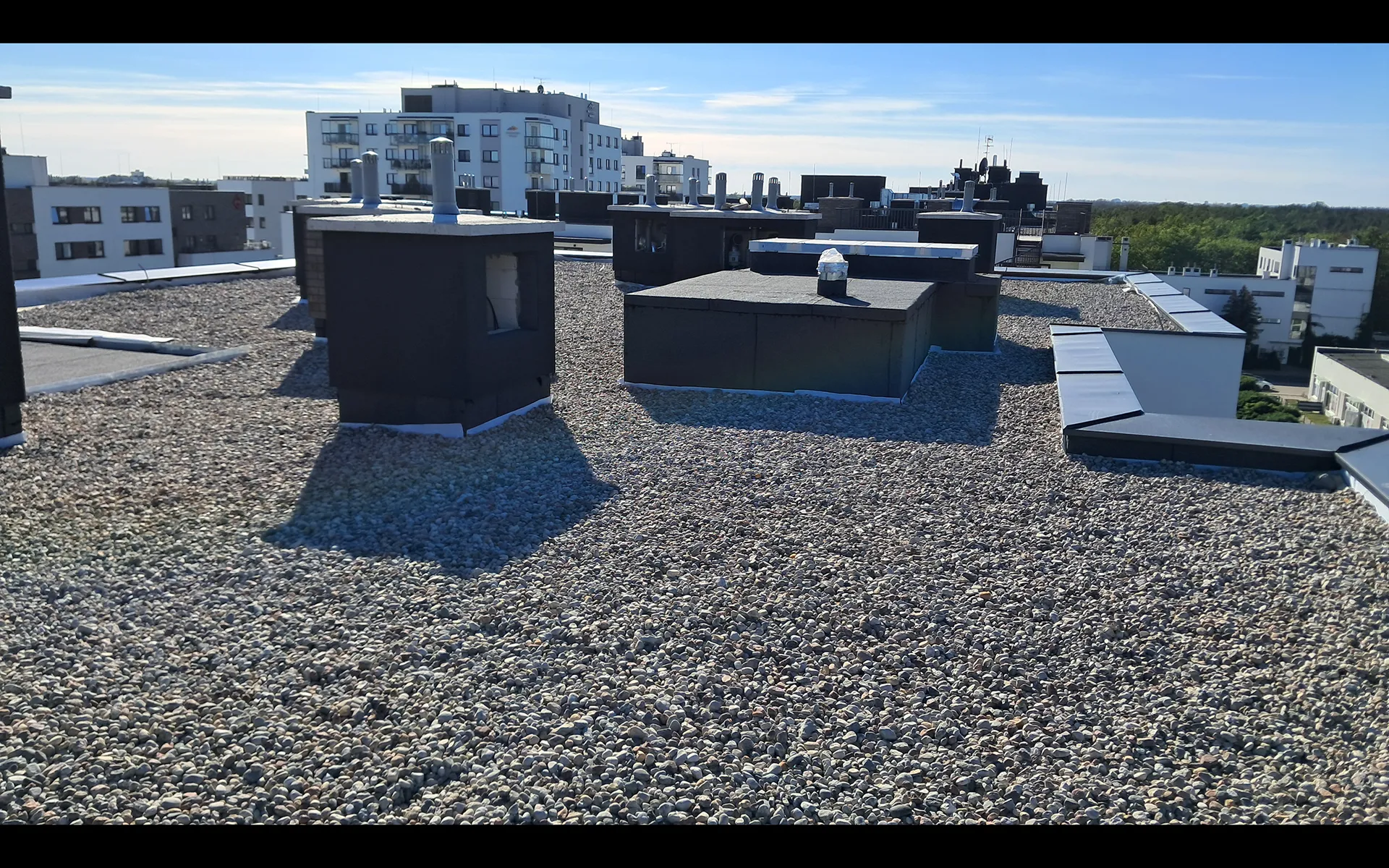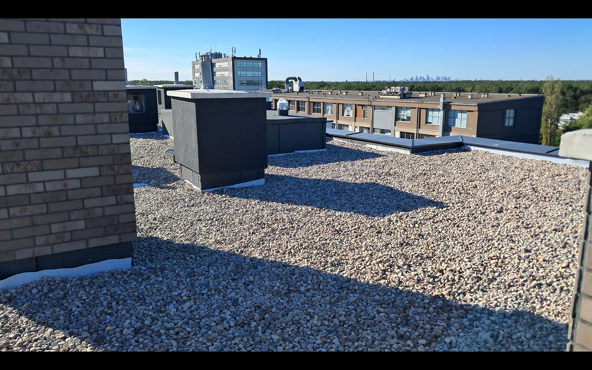2025.09.29 - Dach budynku P10 - warstwa wykończeniowa żwiru;obróbka kominów